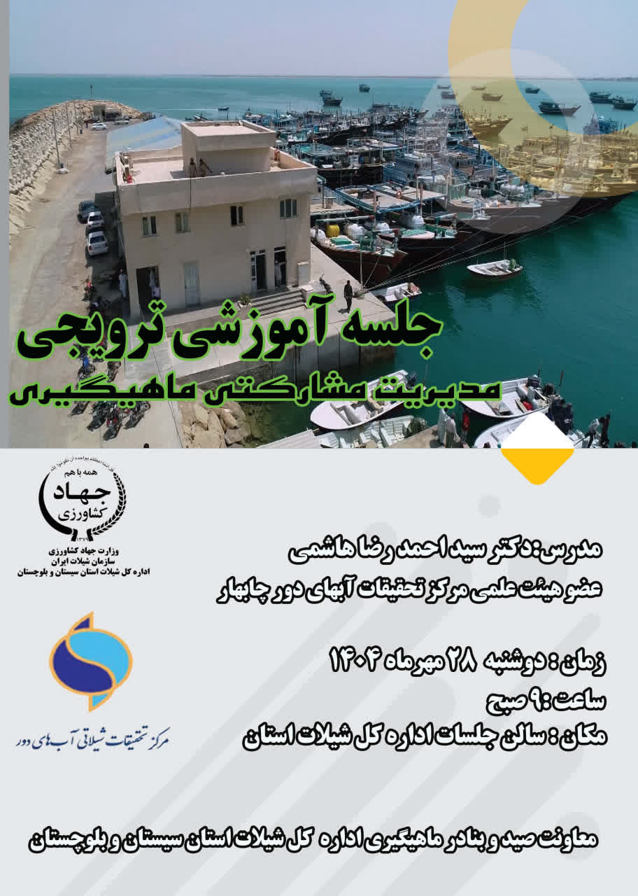 برگزاری دوره آموزشی مدیریت مشارکت صیادی در اداره کل شیلات سیستان و بلوچستان با هدف ارتقای دانش و توانمندسازی ذینفعان حوزه صیادی؛ بررسی مدلهای جهانی و تجربیات محلی مدیریت مشارکتی در کارگاه تخصصی چابهار 1404/7/28 (14) (0) برگزاری دوره آموزشی مدیریت مشارکت صیادی در اداره کل شیلات سیستان و بلوچستان به گزارش روابط عمومی مرکز تحقیقات شیلاتی آب های دور_چابهار، دوره آشنایی با «مدیریت مشارکت صیادی» در جهت ارتقای دانش و مهارت ذینفعان و کارشناسان این عرصه در محل این اداره کل شیلات استان سیستان و بلوچستان برگزار شد. این دوره آموزشی – ترویجی با ارایه سید احمد رضا هاشمی، عضو هیأت علمی مرکز تحقیقات شیلاتی آبهای دور چابهار، برای اتحادیه صیادی استان و کارشناسان مرتبط برگزار گردید. در این کارگاه، مباحث مرتبط با شیوههای نوین مدیریت و توسعه مشارکتهای موثر در بخش صیادی برای حاضران تشریح شد. همچنین مدل های پنج گانه مدیریت مشارکت صیادی در جهان و نمونه های از مدیریت مشارکتی صیادی در استان که در چند سال اخیر شروع گردیده، مورد بحث و تبادل نظر قرار گرفت. شرکتکنندگان در این دوره که از مسئولان تعاونیهای صیادی و کارشناسان شیلات تشکیل میشد، این دوره را گام خوبی در جهت آشنایی با اصول علمی مدیریت و تقویت همکاریهای گروهی برای بهرهبرداری پایدار از ذخایر دریایی دانستند. آنها ابراز امیدواری کردند که ادامهدار بودن چنین دورههایی میتواند نقش بسزایی در ارتقای معیشت جامعه محلی و حفاظت از منابع ارزشمند آبی استان ایفا کند.