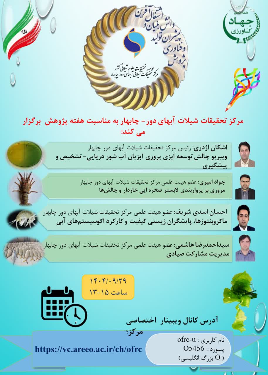 برگزاری وبینارهای تخصصی مرکز تحقیقات شیلاتی آبهای دور چابهار در هفته پژوهش وبینارهای هفته پژوهش فرصتی برای تبادل دانش و معرفی دستاوردهای نوین در اکوسیستم های آبی 1404/9/30 (8) (0) برگزاری وبینارهای تخصصی مرکز تحقیقات شیلاتی آبهای دور چابهار در هفته پژوهش به گزارش روابط عمومی مرکز تحقیقات شیلاتی آبهای دور_چابهار، در بیست و نهم آذرماه ۱۴۰۴، مرکز تحقیقات شیلات آبهای دور چابهار با برگزاری یک سری وبینار تخصصی، میزبان پژوهشگران و علاقهمندان به حوزههای مختلف شیلات و آبزیپروری بود. این وبینارها با هدف تبادل دانش و معرفی آخرین دستاوردهای پژوهشی در این مرکز برگزار شد. در ابتدای جلسه، سیداحمدرضا هاشمی، معاون تحقیقاتی و عضو هیأت علمی مرکز، با تبریک هفته پژوهش، برای پژوهشگران آرزوی موفقیت و پیشرفت کرد. سپس جواد امیری، از اعضای هیئت علمی مرکز، به ارائه "مروری بر پرواربندی لابستر صخرهای خاردار و چالشها" پرداخت و پس از آن، احسان اسدی شریف، عضو هیئت علمی این مرکز، به موضوع "ماکروبنتوزها، پایشگران زیستی کیفیت و کارکرد اکوسیستمهای آبی" اشاره کرد. در پایان، سیداحمدرضا هاشمی نیز سخنرانی با موضوع "مدیریت مشارکت صیادی" را ارائه کرد. این وبینارها به صورت زنده از طریق آدرس اختصاصی مرکز پخش شد و فرصتی ارزشمند برای تبادل نظر و ارتقای دانش تخصصی در حوزههای مرتبط با شیلات و اکوسیستمهای آبی فراهم آورد.